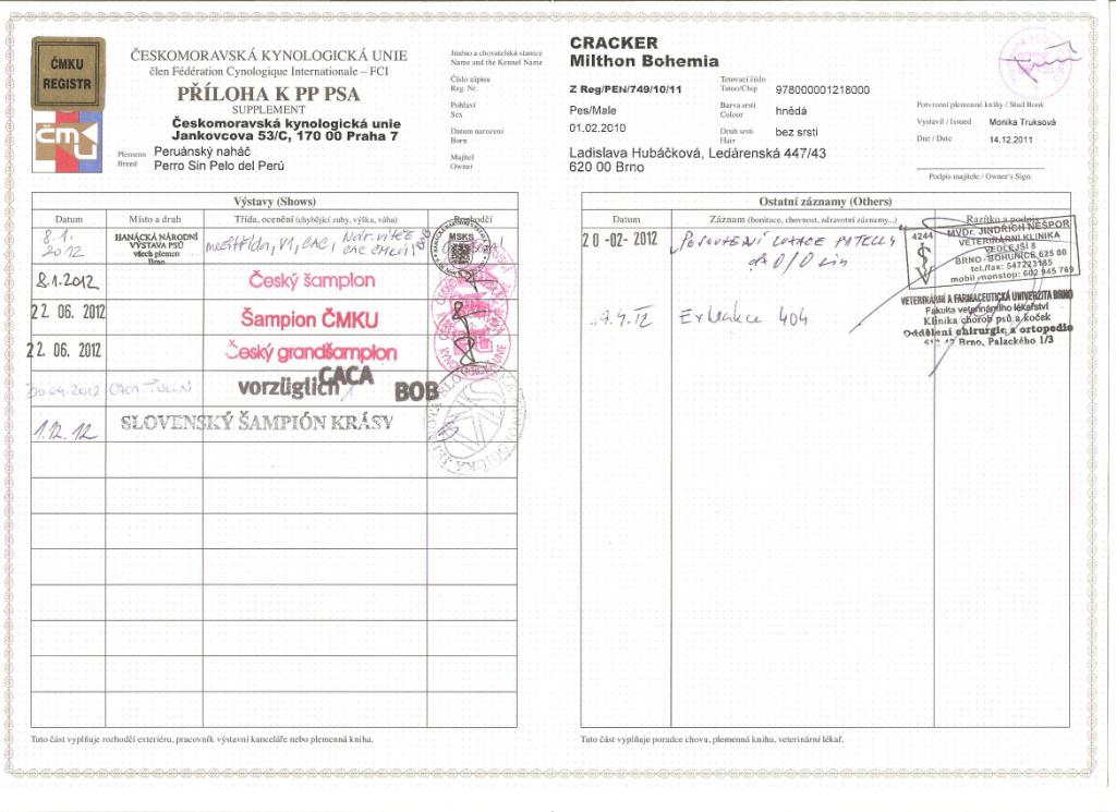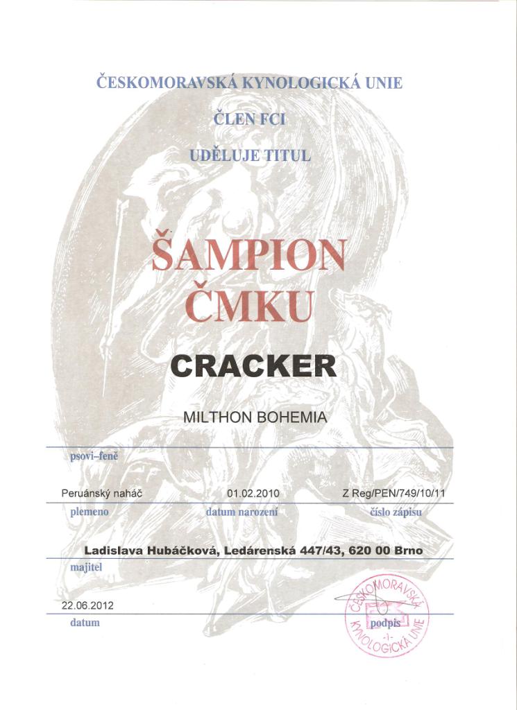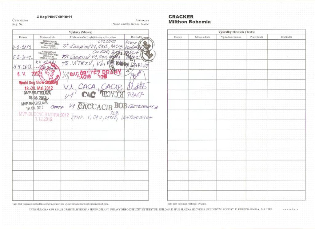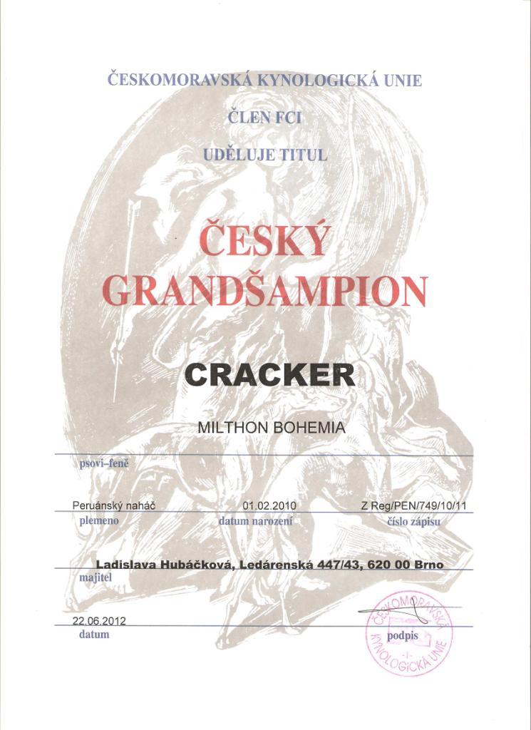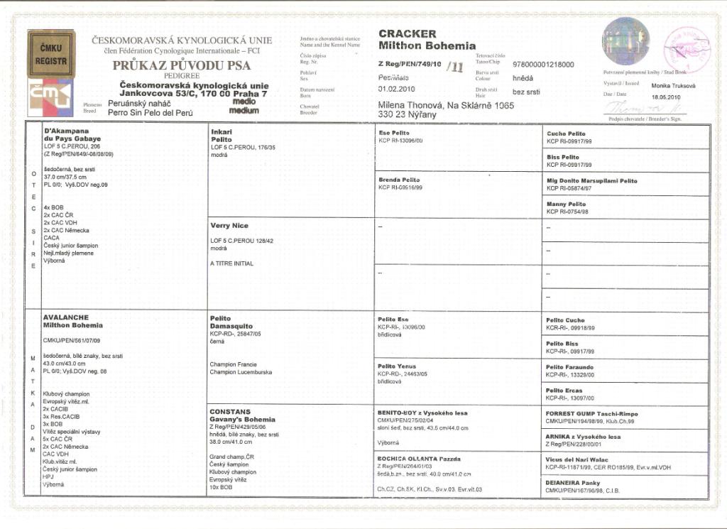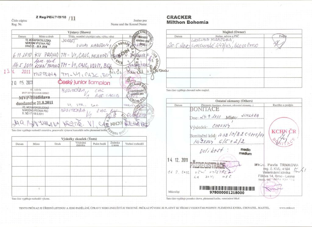 Pedigree - průkaz původu Cracker Milthon Bohemia