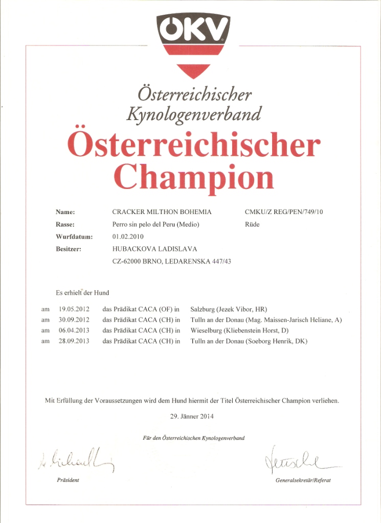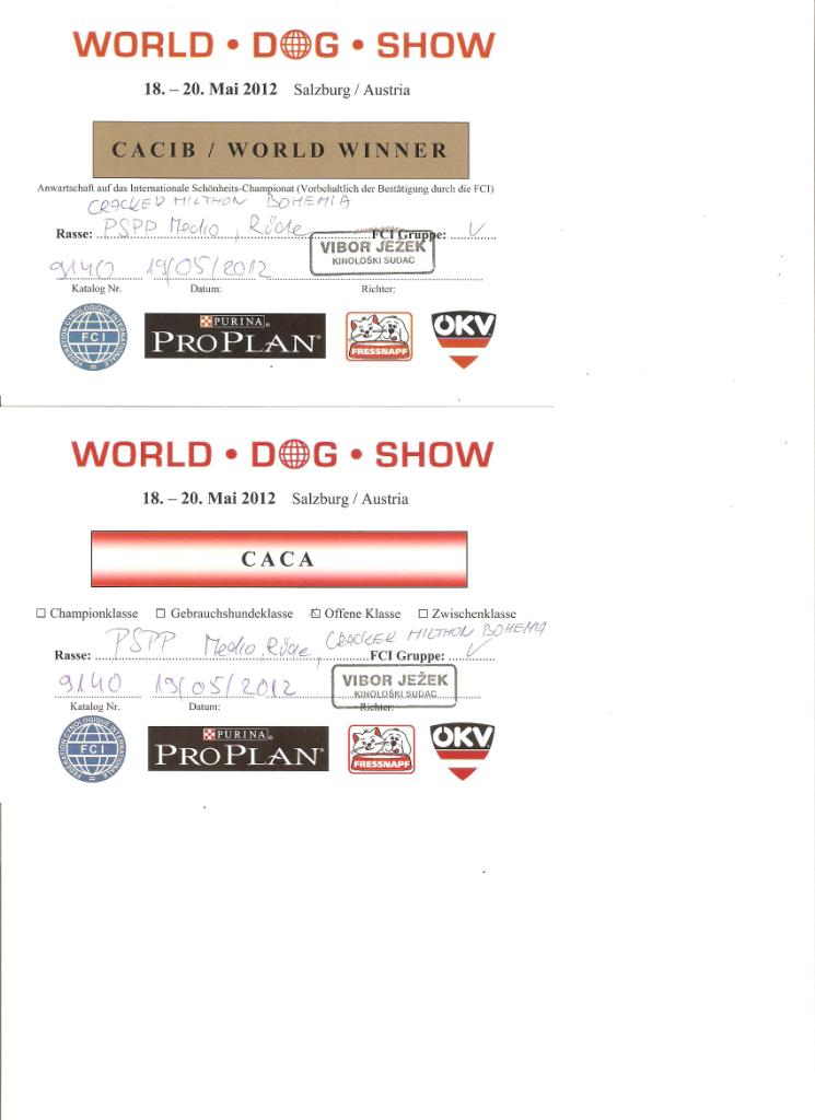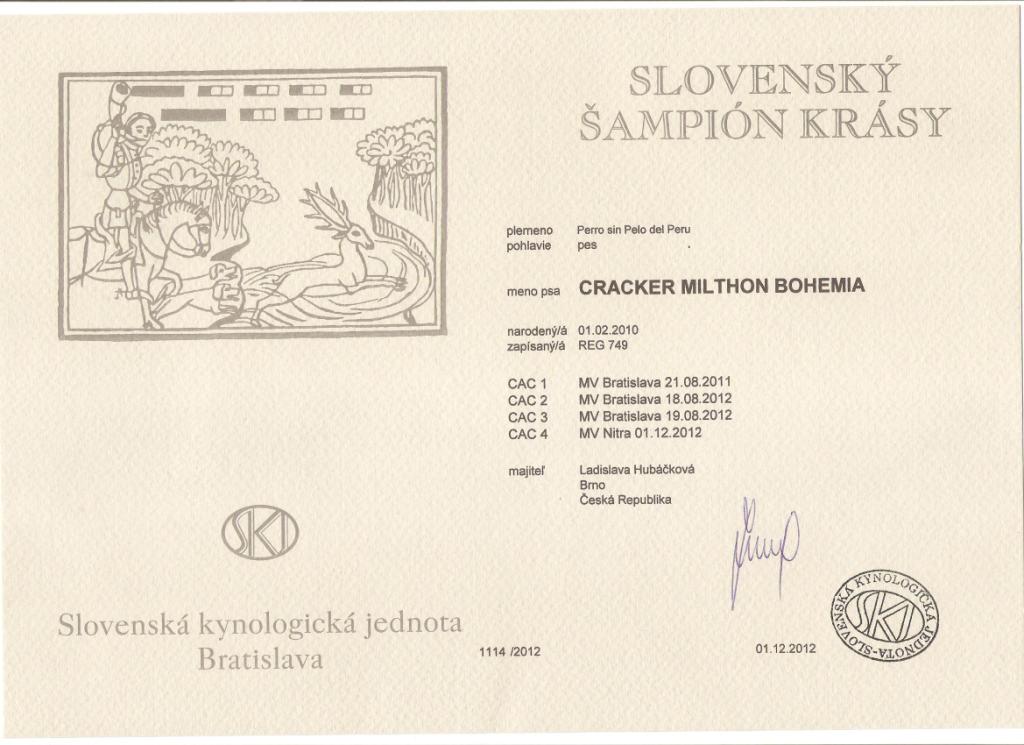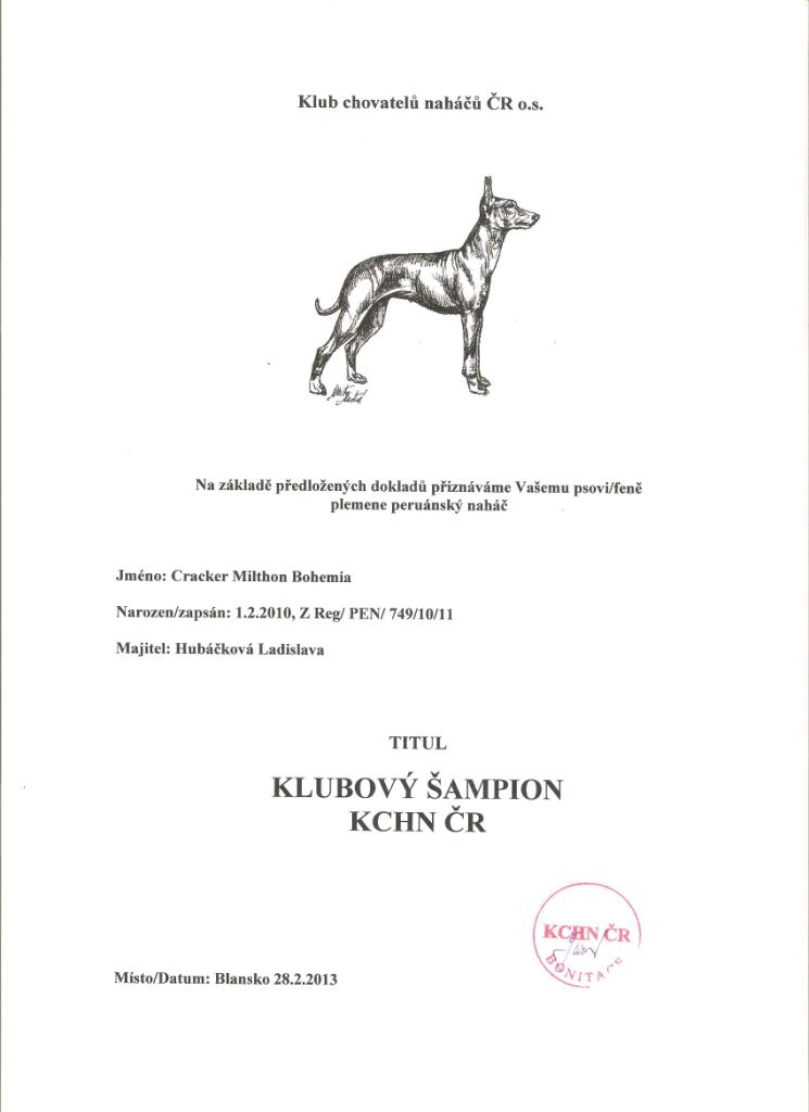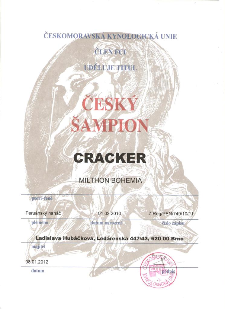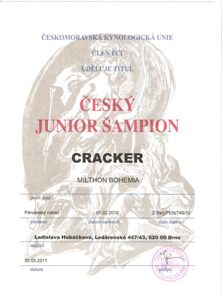 Pedigree - průkaz původu Cracker Milthon Bohemia